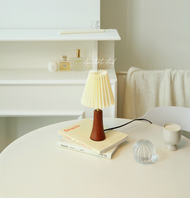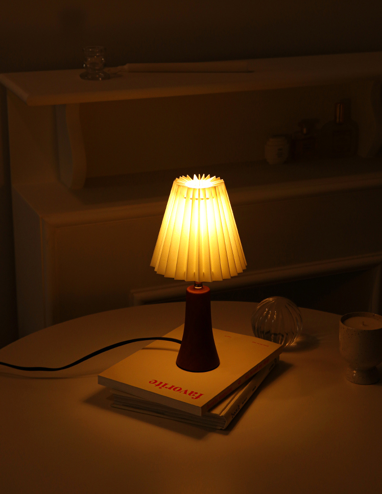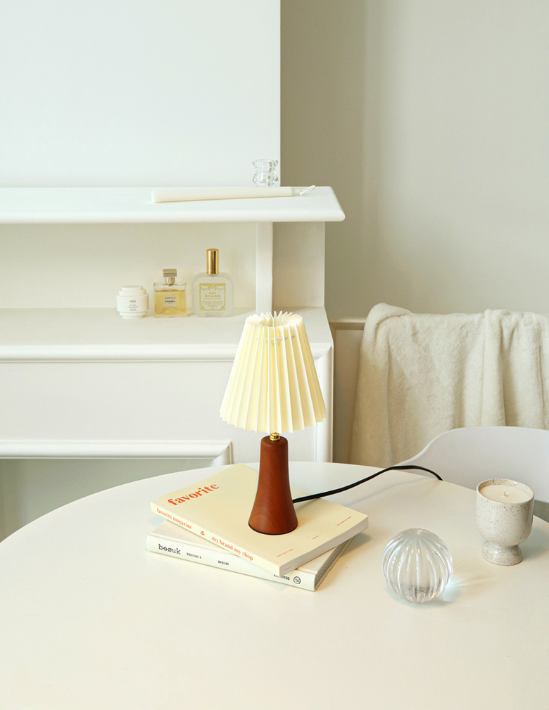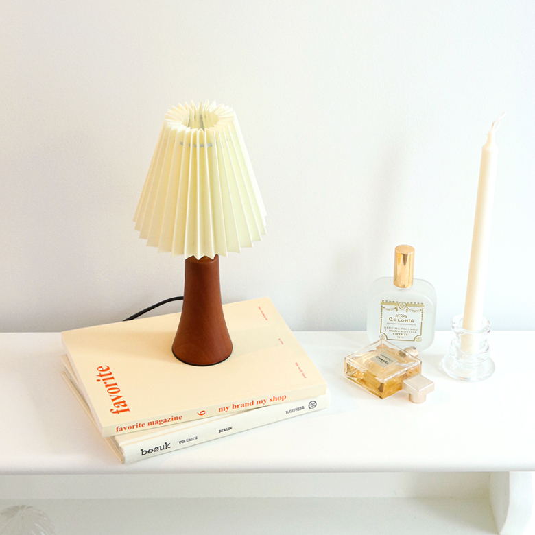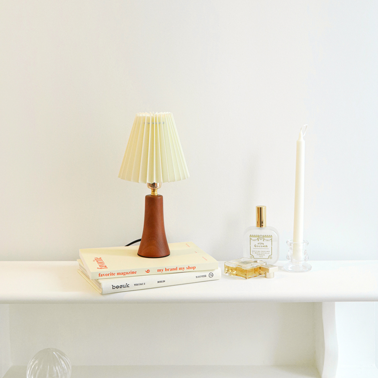 라이트한 아이보리 색상의 페브릭으로 이뤄진 플리츠 쉐이드와 아담한 사이즈의 원목 바디로